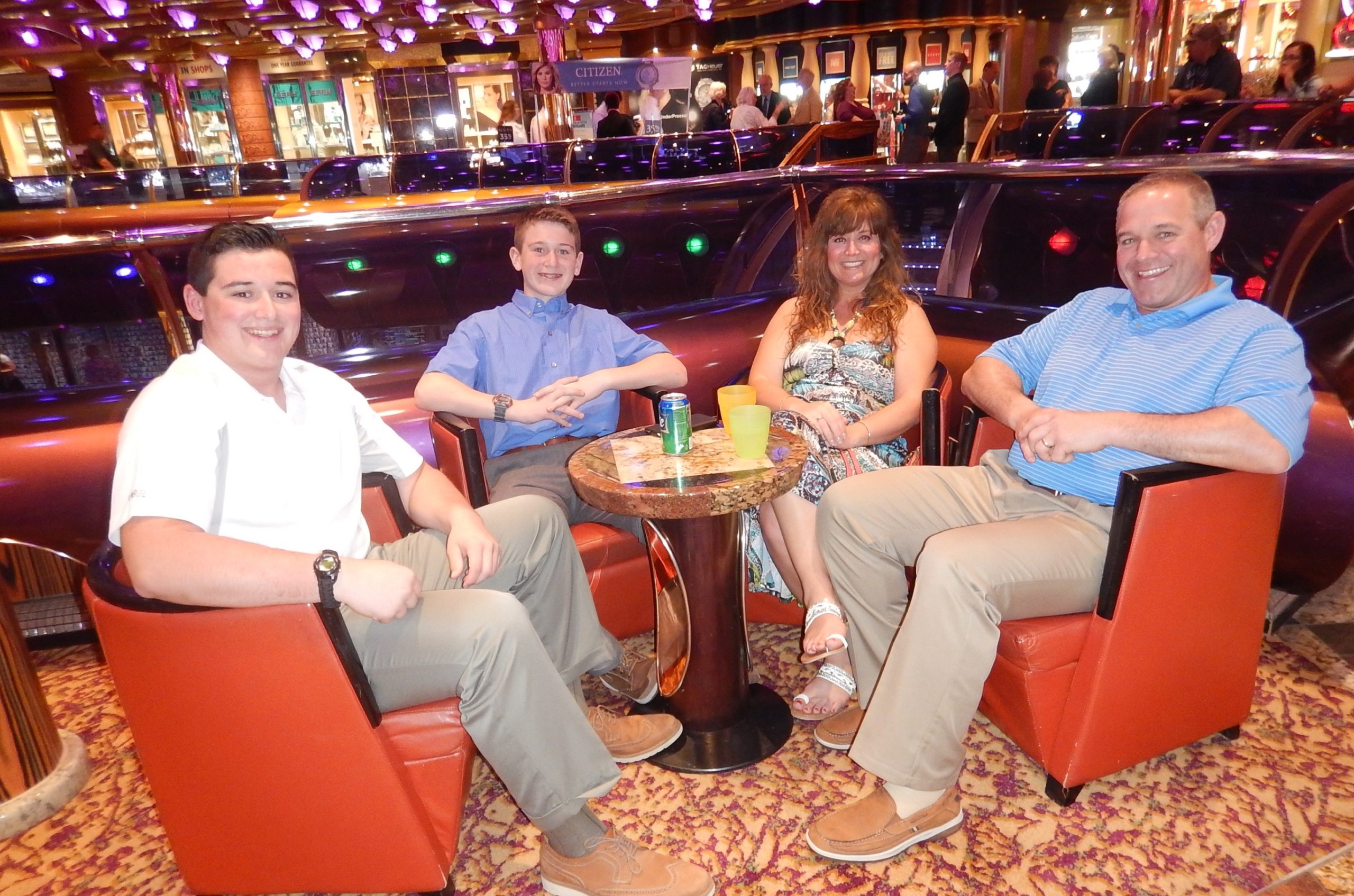 Each person in our family has different preferences for daytime entertainment. I love to lay in the sun with a book and be left alone. My sons enjoy playing basketball on the top deck or playing on the water slide or using the running track. My husband enjoys people watching in the shade around the pool area in between naps, but in the evenings we reconnect over dinner and the evenings entertainment together.