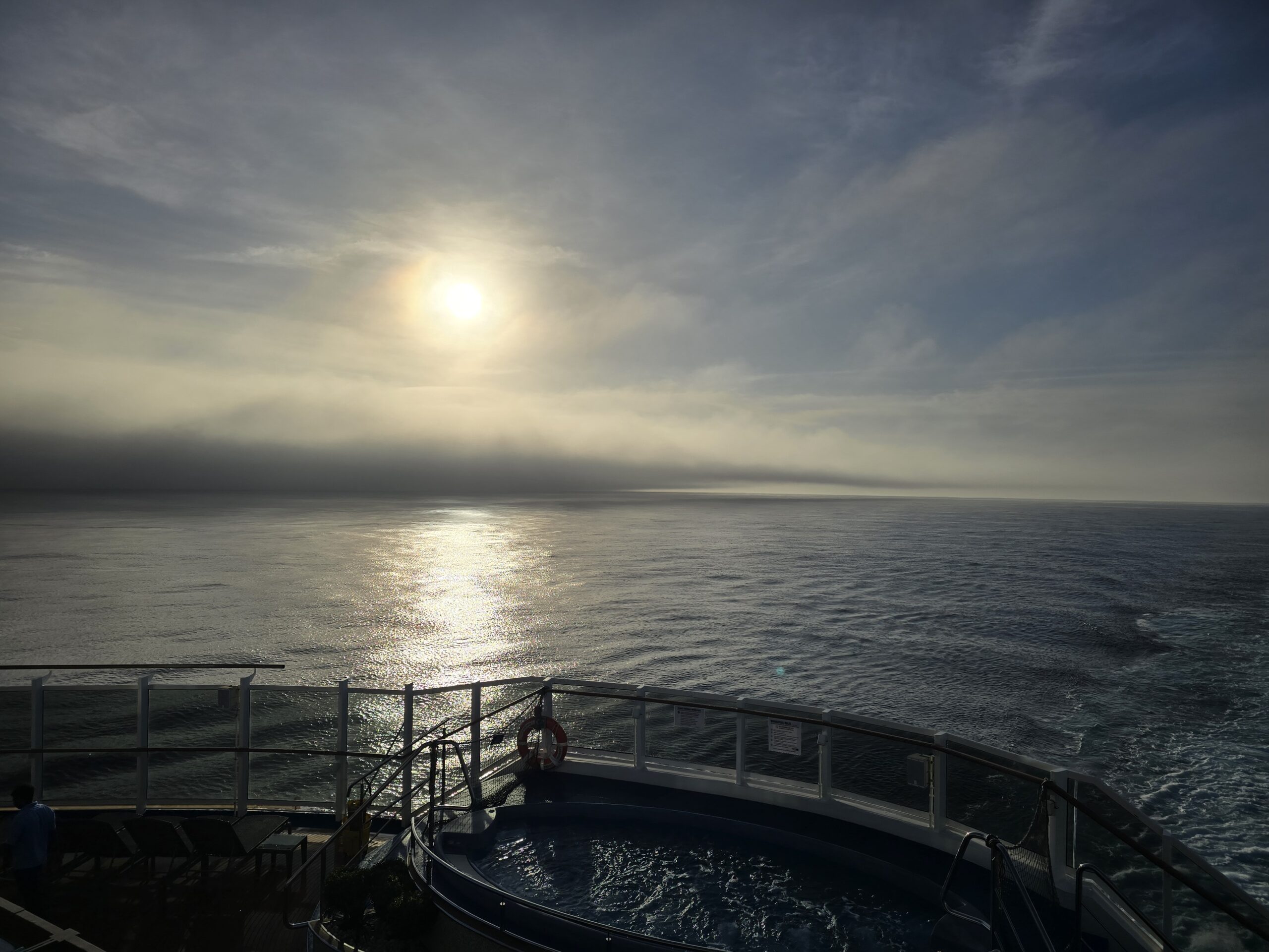 We tend to enjoy the sunset pre-dinner time along with a cocktail hour in our cabin on our private balcony or out on public deck space. The spectacular sunsets set the mood for a most enjoyable evening! We have been so fortunate to have excellent weather on our cruises and fabulous experiences with sunsets!
