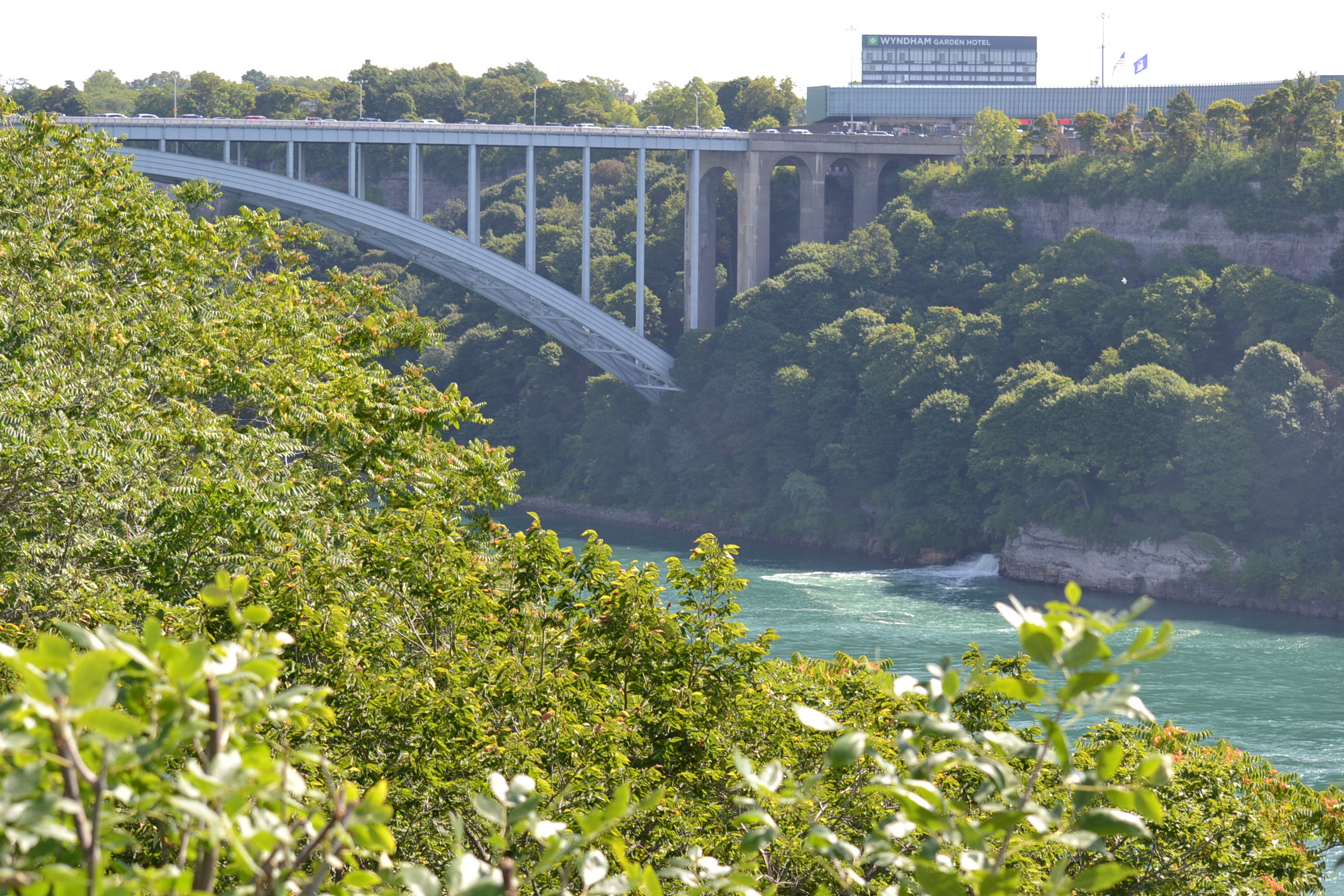 The Rainbow Bridge in Niagara Falls is the gateway between the cities of Niagara Falls NY and Canada. This is the view as you cross the bridge in bumper to bumper traffic awaiting your turn to go through customs. You can cross the bridge by auto, on foot or bicycle. It was remarkable! What an amazing border crossing transition from Canada back into the USA!