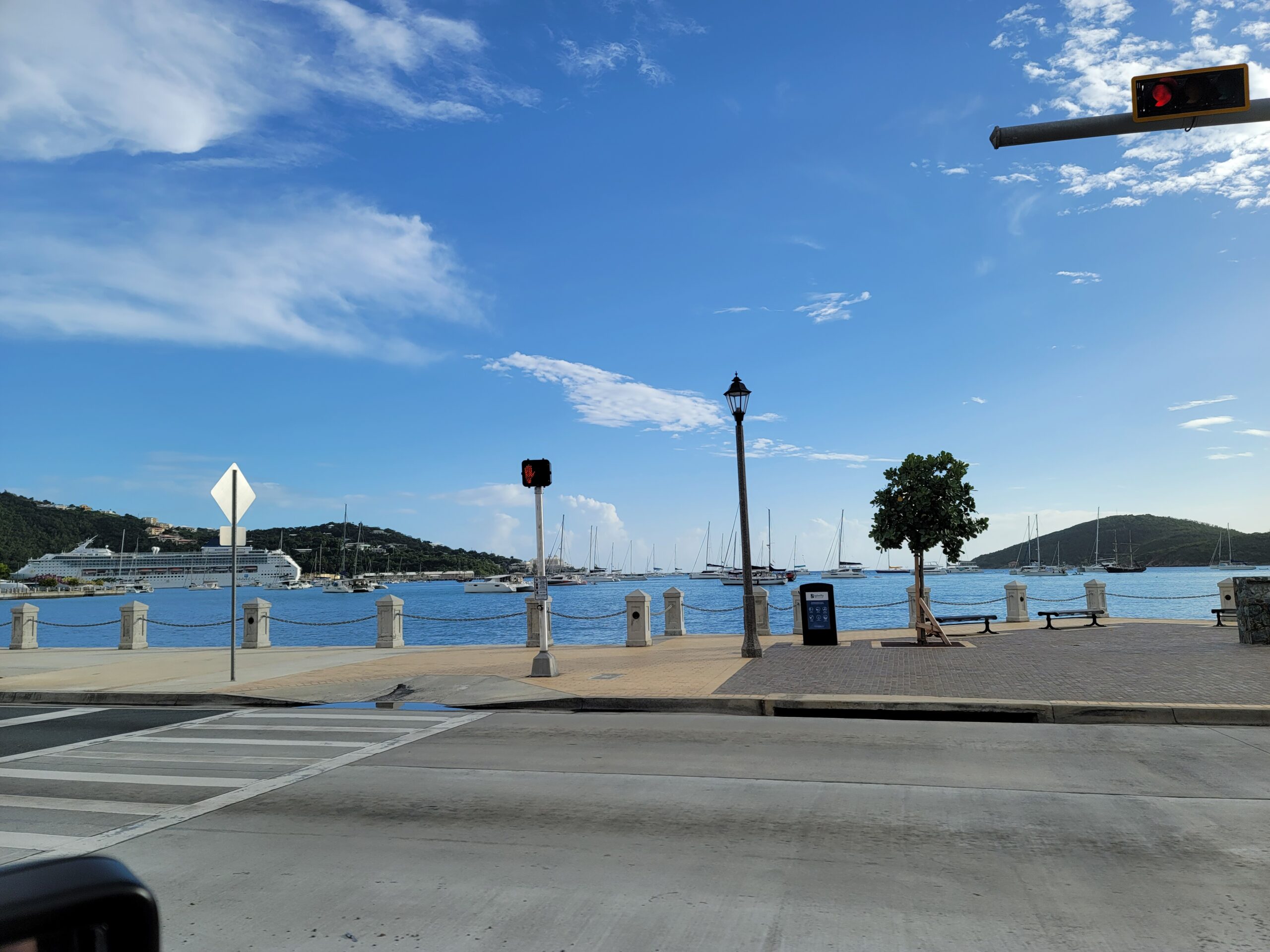 It was raining prior to our landing here in Saint Thomas, USVI. Upon landing, you walk from the plane to the tarmac outside to your welcoming gate. Locals in cultural costumes welcome you within the airport. It was an instant Caribbean party theme!